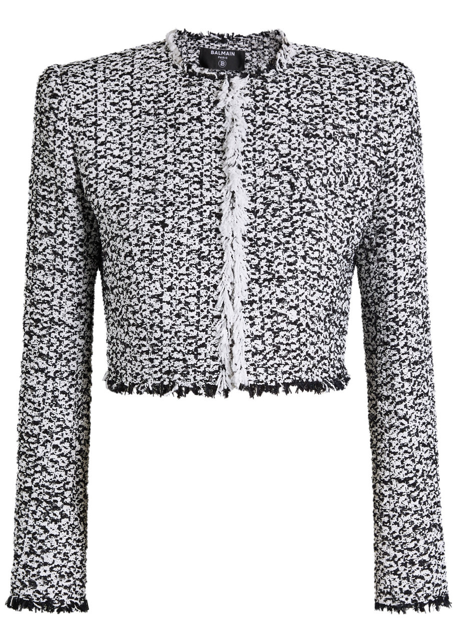 Info & Care Balmain tweed jacket Round-neck, padded shoulders, button-fastening cuffs, fringed trims, designer-engraved hardware, fully lined Concealed hook fastenings;through front 93% polyamide, 7% viscose; lining: 52% viscose, 48% cotton Dry clean Coordinating items available Size & Fit Length shoulder to hem: 15.5 inches/ 39.5cm Midweight Fitted style, cropped Model is 5'10"/ 178cm and wears a size;FR36