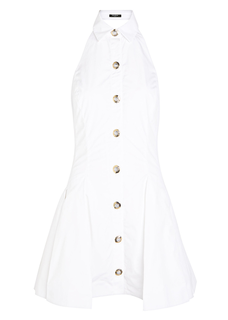 Info & Care Balmain cotton-poplin dress Halterneck, darts through waist, low back, box pleats, designer-engraved hardware, fully lined Button fastenings through front; 100% cotton Dry clean; Size & Fit Length shoulder to hem: 28 inches/ 71cm Midweight Fit-and-flare style Model is 5'8"/ 173cm and wears a size;FR36