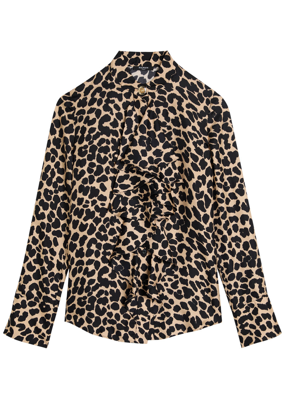 Info & Care Balmain silk blouse Leopard print, stand collar, button-fastening flared cuffs, ruffled panel at front, designer-engraved hardware with hammered finish Partially concealed button fastenings through front 100% silk Dry clean Size & Fit Length shoulder to hem: 27 inches/ 68.5cm Midweight Regular;fit Model is 5'9"/ 175cm and wears a size;FR36