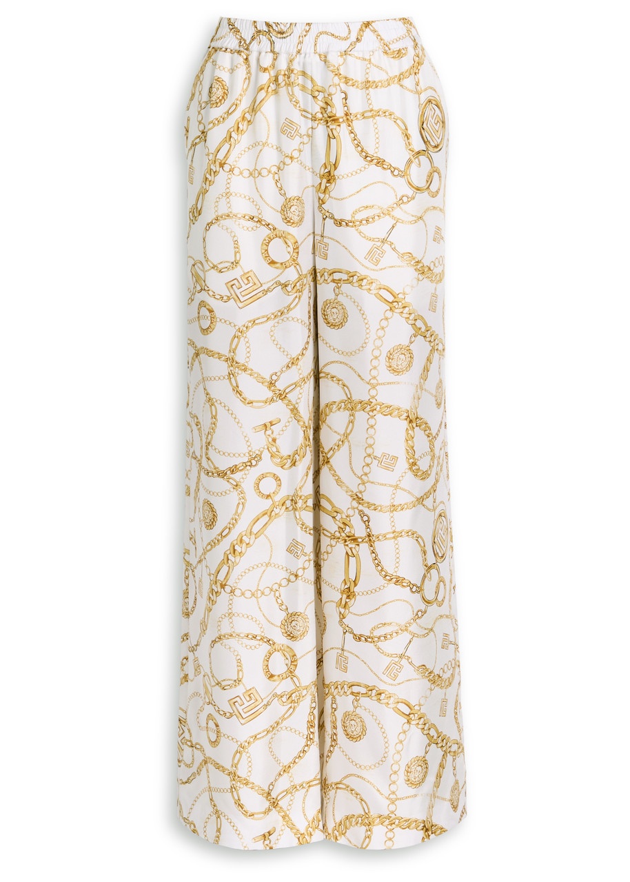 Info & Care Balmain silk trousers Printed, elasticated waist, side slip pockets Pulls on 100% silk Dry clean Size & Fit Inside leg length: 30 inches/ 76cm Midweight Wide-leg cut Model is 5'9"/ 175cm and wears a size;FR36