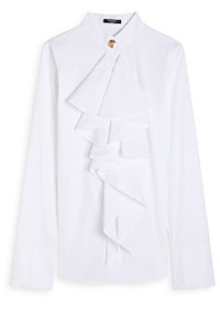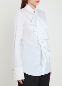 Info & Care Balmain cotton-poplin blouse Button-fastening high collar, flared button-fastening cuffs, ruffled panel through front, sculpted hardware, curved hem, longer back hem Concealed button fastenings through front; 100%;cotton Dry clean Size & Fit Length shoulder to hem: 26 inches/ 66cm; back: 27.5 inches/ 70cm Midweight Slightly loose fit Model is 5'9"/ 175cm and wears a size;FR36