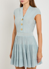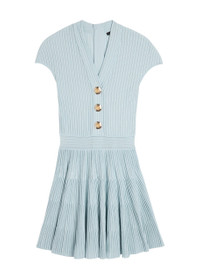 Info & Care Balmain knit dress Textured, ribbed, V-neck, cap sleeves, faux metal buttons with hammered finish, designer-engraved hardware Zip fastening at back; 83% viscose, 15% polyester, 2% polyamide Dry clean Size & Fit Length shoulder to hem: 32 inches/ 81.5cm Midweight Fit-and-flare style,;A-line cut Model is 5'9"/ 175cm and wears a size FR36