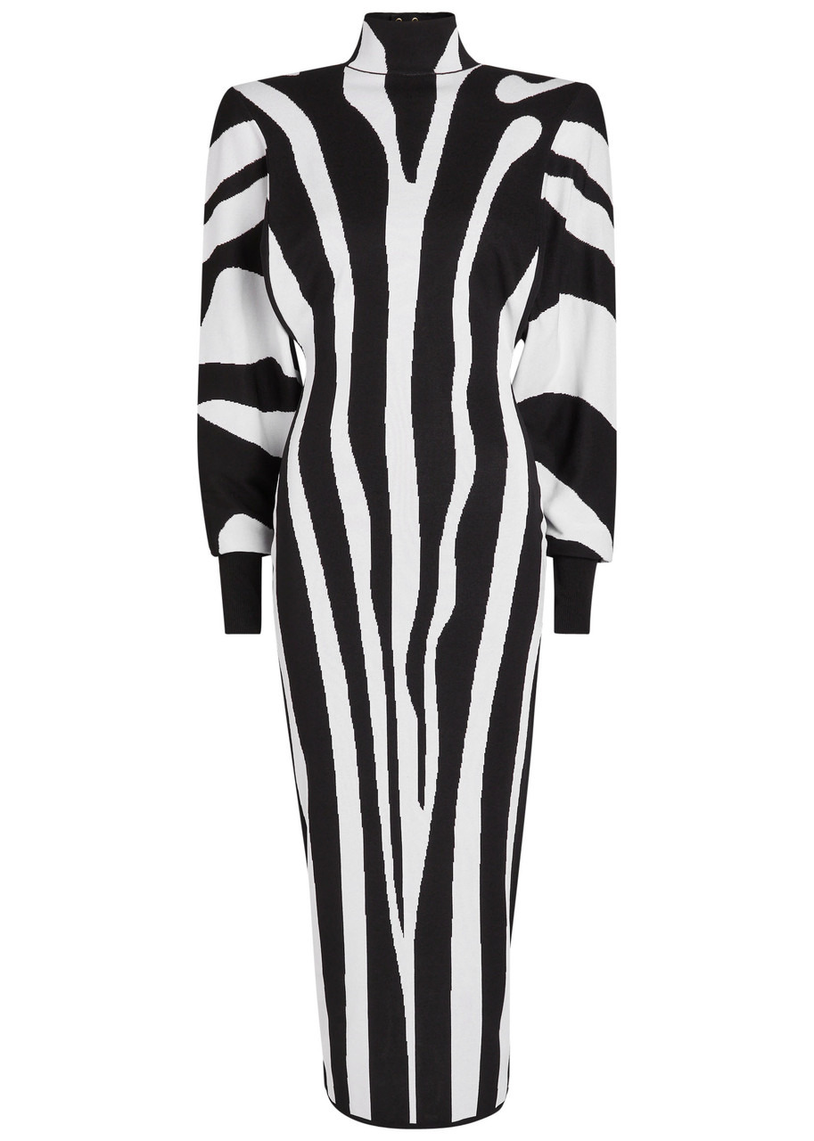 Info & Care Balmain knit dress Zebra jacquard, high-neck, padded shoulders, rib-knit cuffs, cut-out open back, back vent Zip and press-stud fastenings at back 92% viscose, 7% polyester, 1% elastane Dry clean; Size & Fit Length shoulder to hem: 50 inches/ 127cm Midweight Slim fit, relaxed sleeves Model is 5'10"/ 178cm and wears a size FR36