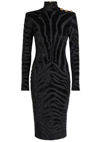 Info & Care Balmain velvet and woven dress Zebra-effect jacquard, high-neck, padded shoulders, designer-engraved faux button embellishments at shoulder, fully lined Zip fastening at back Fabric 1: 70% viscose, 30% polyester; fabric 2: 60% viscose, 40% polyester; lining: 95% polyester, 5% elastane Dry clean; Size & Fit Length shoulder to hem: 41 inches/ 104.5cm Midweight Slim fit Model is 5'10"/ 178cm and wears a size;FR36