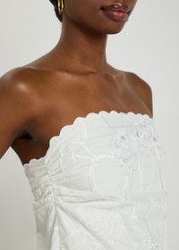 Info & Care Bernadette cotton top Floral-embroidery, sequin embellishments, strapless, ruched details at side, scalloped trims, fully lined Tie-fastening at back 100% cotton Dry clean Size & Fit Length shoulder to hem: 12 inches/ 30.5cm Midweight Slim fit Model is 5'10"/ 178cm and wears a size;FR36
