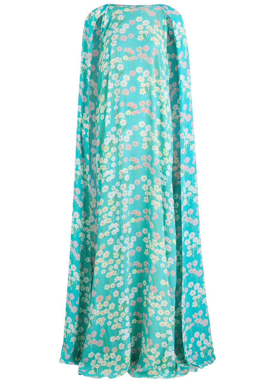 Info & Care Bernadette chiffon;gown Printed, draped cape design,;round-neck Concealed hook fastening at back neck 100% viscose Dry clean Size & Fit Length shoulder to hem: 66 inches/ 168cm Midweight Loose fit Model is 5'10"/ 178cm and wears a size;FR36