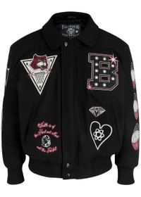 Info & Care Billionaire Boys Club wool-blend varsity jacket Designer;patchwork;appliques, padded, button-fastening collar, side slip pockets, designer tag at side, ribbed trims, fully lined Partially concealed press-stud and zip fastenings through front 50% wool, 50% polyester: lining: 100% polyester Hand wash Size & Fit Length shoulder to hem: 25 inches/ 63.5cm Midweight Slightly relaxed fit Model is 6'1"/ 185cm, chest size 38 inches;and wears a size medium