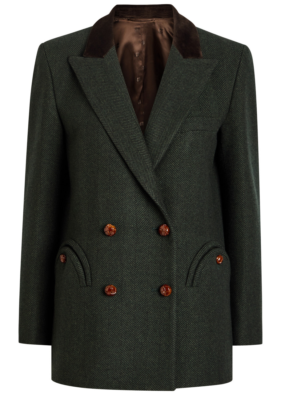 Info & Care Blaze Milano wool blazer Herringbone, peaked lapels with contrasting velvet detail, lightly padded shoulders, button-fastening cuffs, chest slit pocket, two button-fastening sculpted pockets at front, two back vents, sculpted hardware, internal patch pocket, three internal button-fastening pockets, fully lined Double-breasted button fastenings at front 100% wool; lining: 100% viscose; sleeve lining: 60% acetate, 40% viscose Dry clean Size & Fit Length shoulder to hem: 28 inches/ 71cm Midweight Designed to be worn oversized, straight cut Tailored style Model is 5'10"/ 178cm and wears a size 1