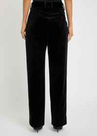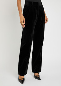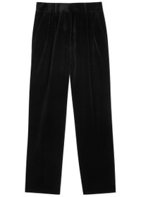 Info & Care Blaze Milano velvet trousers Belt loops, pleats at waist, side slant pockets, pressed crease through legs, sculpted back slit pocket, partially lined Concealed zip, hook and;button fastening at front 100% cotton; lining: 100% viscose Dry clean Size & Fit Inside leg length: 31 inches/ 79cm Midweight Slightly loose fit, straight-leg cut Model is 5'10"/ 178cm and wears a size;1