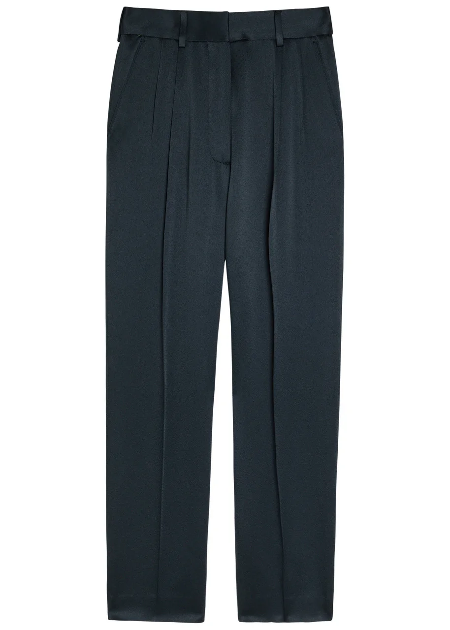 Info & Care Blaze Milano satin trousers Belt loops, side slip pockets, pleats at front waist, pressed crease through legs, faux back slit pocket Concealed button, hook and zip fastening at front 52% viscose, 48% acetate Dry clean Size & Fit Inside leg length: 32 inches/ 81cm Midweight Straight-leg cut Model is 5'9"/ 175cm and wears a size;1