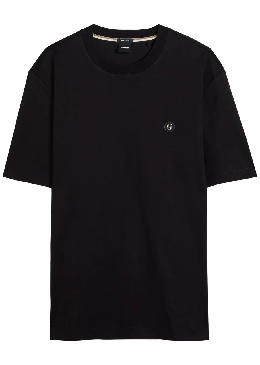 Info & Care Boss cotton T-shirt Ribbed crew-neck, designer logo applique at chest, designer tag at side, splits at side hem Slips on 100% cotton Machine wash Size & Fit Length shoulder to hem: 27 inches/ 68.5cm Midweight Relaxed fit Model is 6'1"/ 185cm, chest size 38.5 inches and wears a size medium