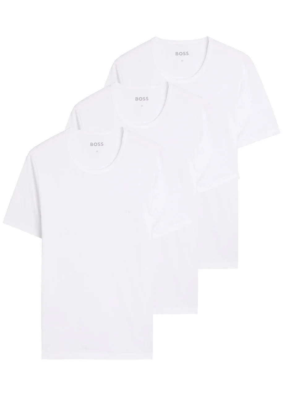 Info & Care Hugo Boss cotton T-shirt; Set of three Ribbed crew-neck, logo embroidery at chest Slips on 100% cotton Machine wash Size & Fit Length shoulder to hem: 26 inches/ 64cm Midweight Regular fit Model is 6'1"/ 185cm, chest size 36 inches and wears a size medium