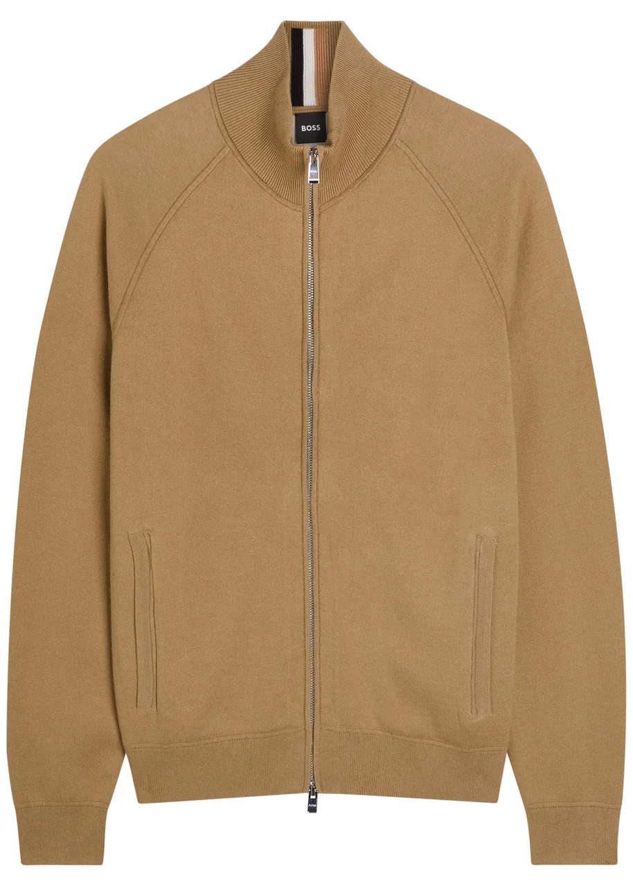 Info & Care Boss cotton and wool-blend cardigan; High neck, raglan sleeves, zip-fastening side slip pockets, designer tag at side, ribbed trims; Two-way zip fastening through front 70% cotton, 30% virgin wool Machine wash Size & Fit Length shoulder to hem: 25 inches/ 64cm Midweight Regular fit Model is 6'1"/ 185cm, chest size 38 inches and wears a size medium