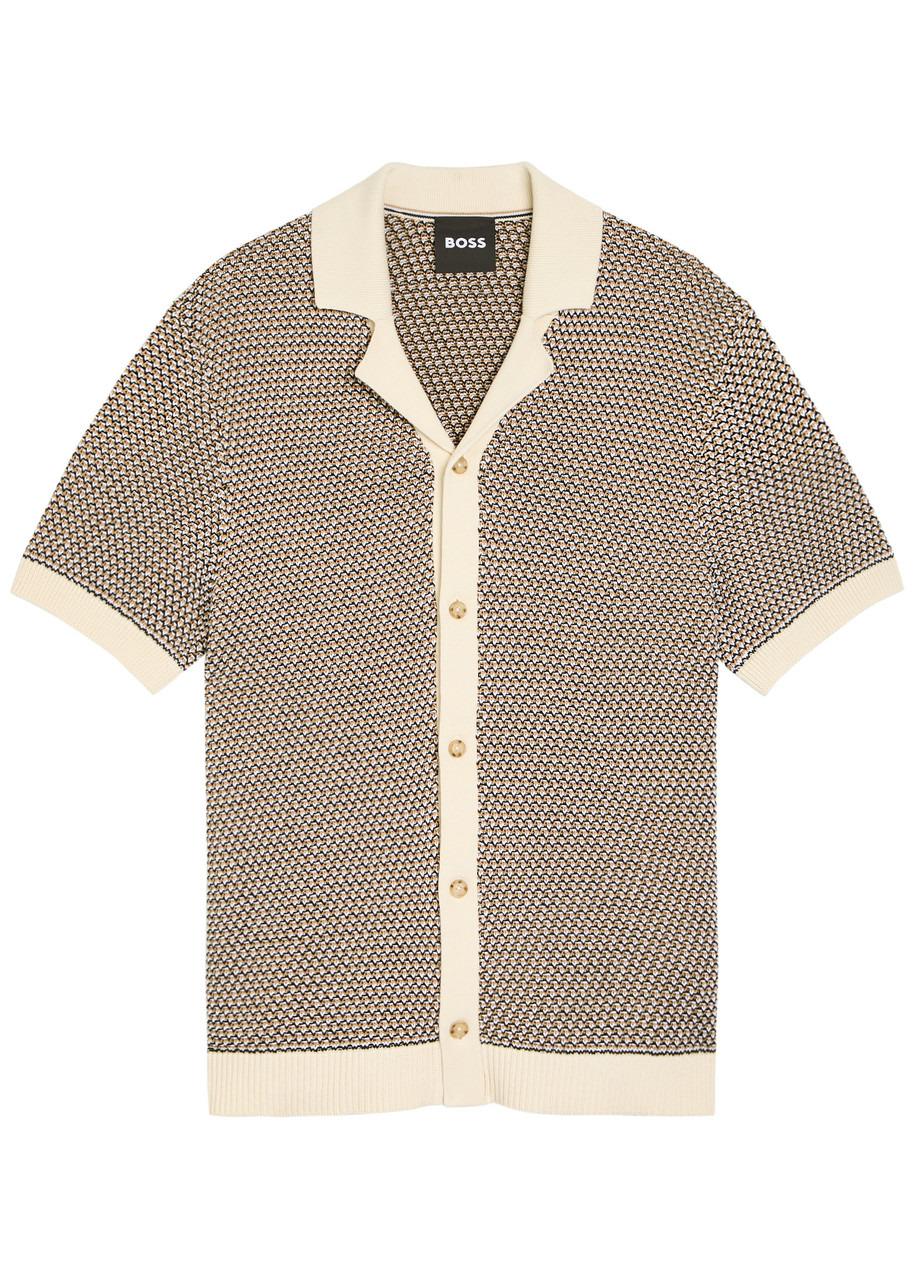 Info & Care Boss;cotton shirt Chunky knit, camp collar, designer tag at side, ribbed trims Button fastenings through front 100% cotton Machine wash Size & Fit Length shoulder to hem: 28 inches/ 71cm Midweight Relaxed, boxy fit Model is 6'1"/ 185cm, chest size 36 inches and wears a size medium