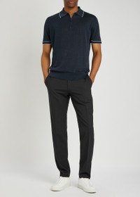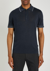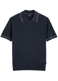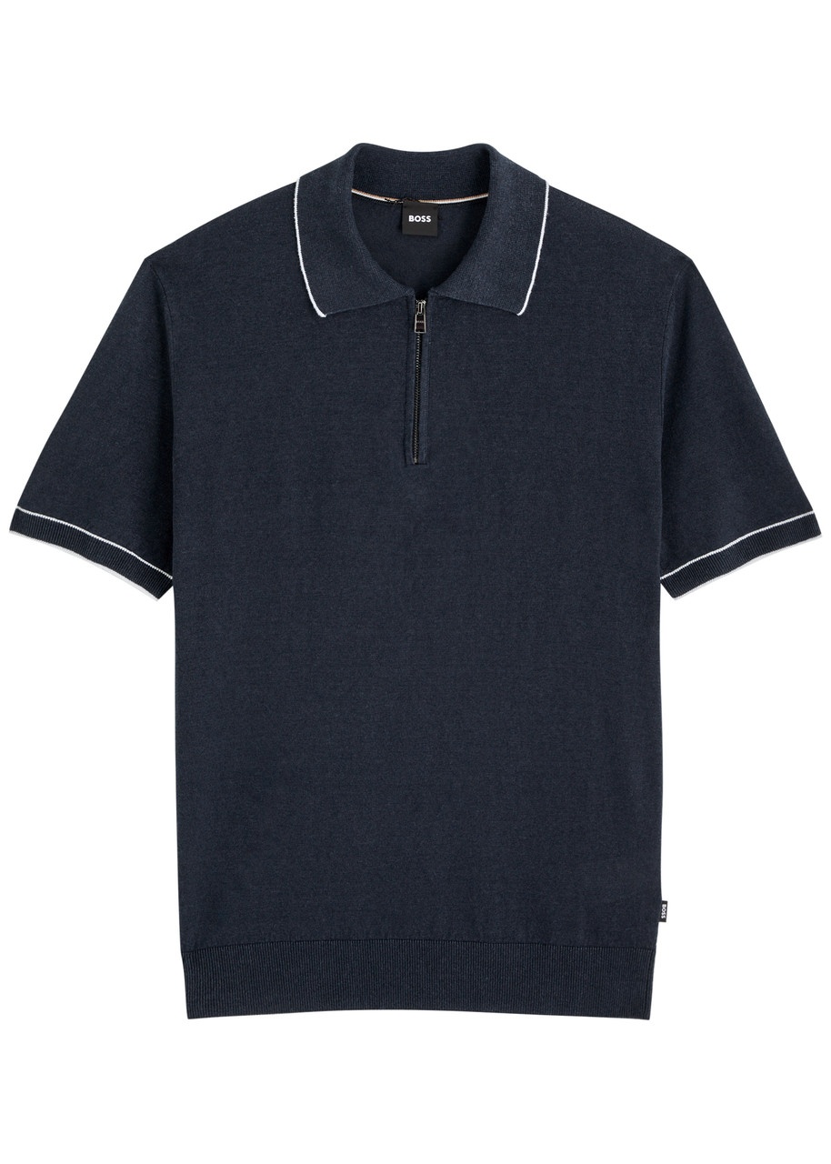 Info & Care Boss;linen-blend;polo shirt Zip-fastening collar, contrasting striped trims at collar and cuffs, designer tag at side, ribbed trims; Slips on 56% linen, 44% viscose; Machine wash; Size & Fit Length shoulder to hem: Midweight Regular fit Model is 6'2"/ 188cm, chest size 38 inches and wears a size medium