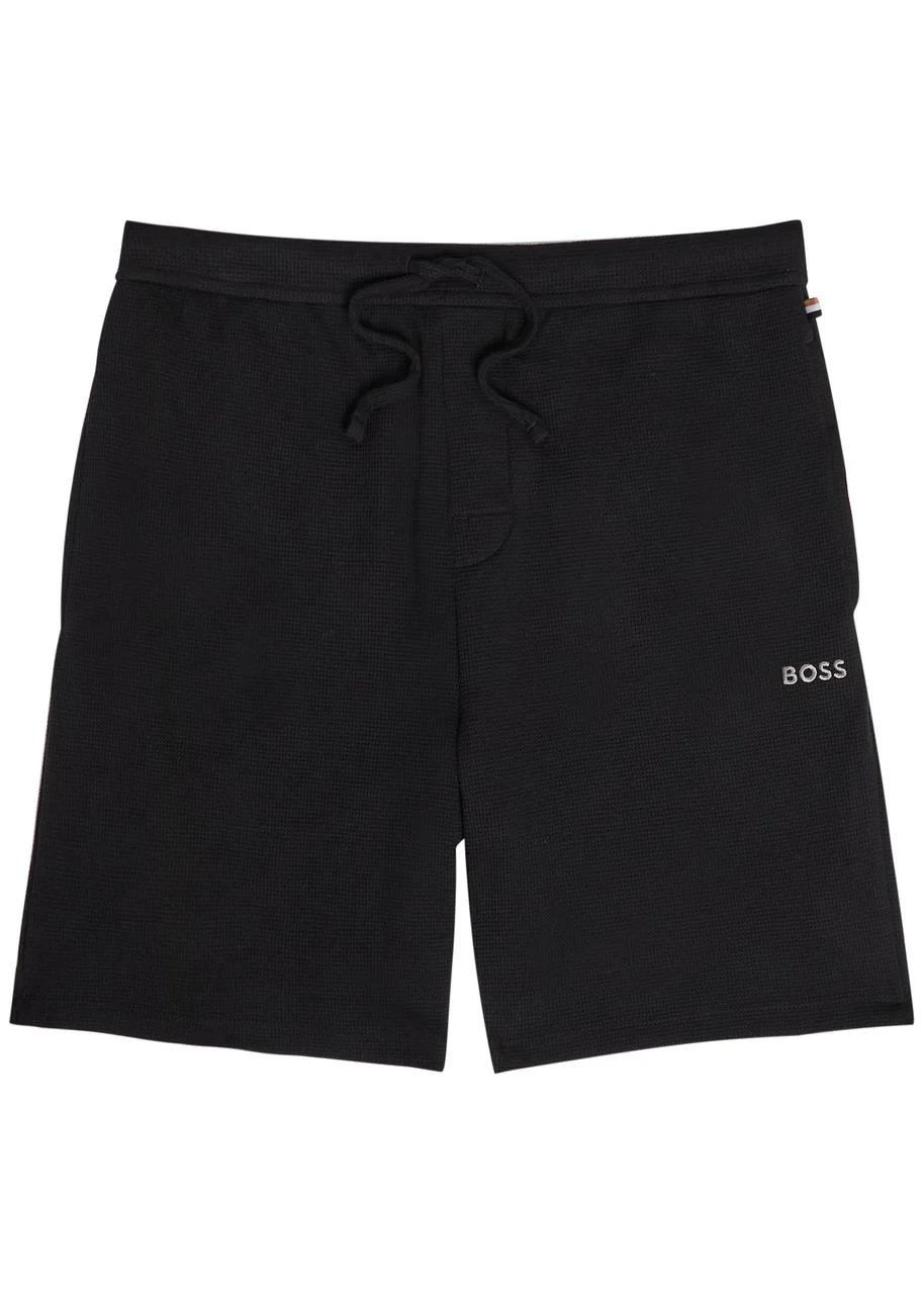 Info & Care Hugo Boss waffle shorts; Drawstring waistband, side slip pocktes, designer embroidery at front, designer tag at waistband Pull on 60% cotton, 40% polyester Machine wash; Size & Fit Length waist to hem: 18.5 inches/ 47.5cm Midweight Regular fit Model is 6'1"/ 185cm and wears a size medium