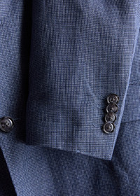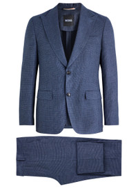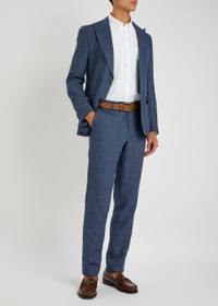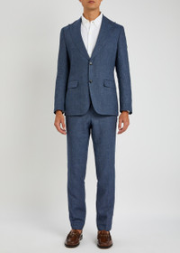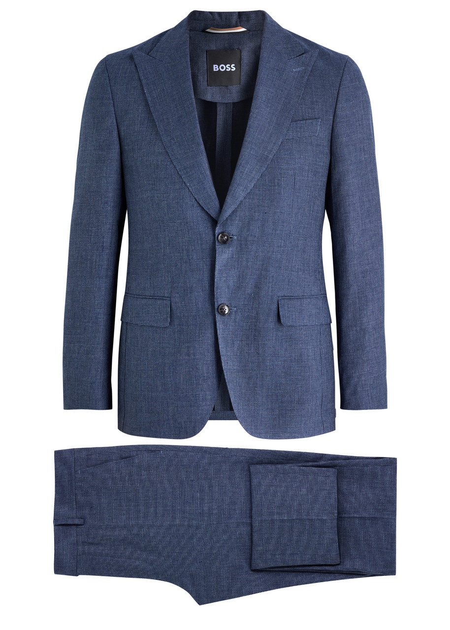 Info & Care Boss;linen-blend suit Blazer: patterned-intarsia, peaked lapels, button-fastening cuffs, chest slip pocket, two front flap pockets, back vents, two internal slip pockets, fully lined, button fastenings through front Trousers: patterned-intarsia, belt loops, pressed crease through legs, two side slip pockets, darted back, two button-fastening back pockets, unfinished cuffs to allow for length alterations, partially lined, partially concealed zip hook and button fastening at front 55% linen, 32% viscose, 13% virgin wool; lining: 100% viscose Dry clean; Size & Fit Length shoulder to hem: 28 inches/ 71cm Inside leg length: 32 inches/ 81cm Midweight Regular fit blazer, straight-leg cut trousers Model is 6'1"/ 185cm, chest size 38.5 inches and wears a size;IT48