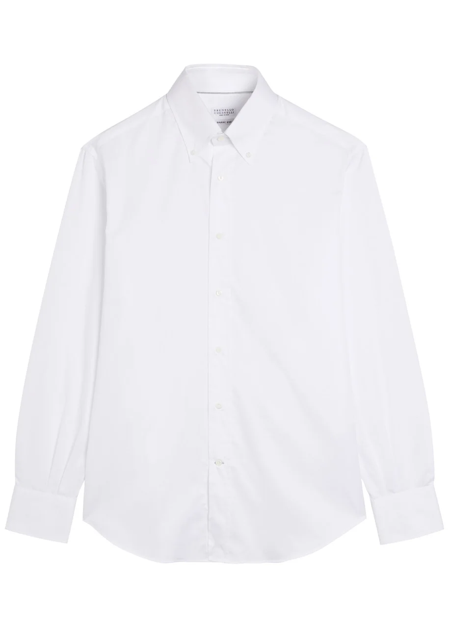 Info & Care Brunello Cucinelli cotton-poplin shirt Button-down collar, button-fastening cuffs, inverted box pleat at back, curved hem Button fastenings through front 100% cotton Machine wash Size & Fit Length shoulder to hem: 28 inches/ 71cm Midweight Regular fit Model is 6'2"/ 188cm, chest size 38 inches and wears a size medium