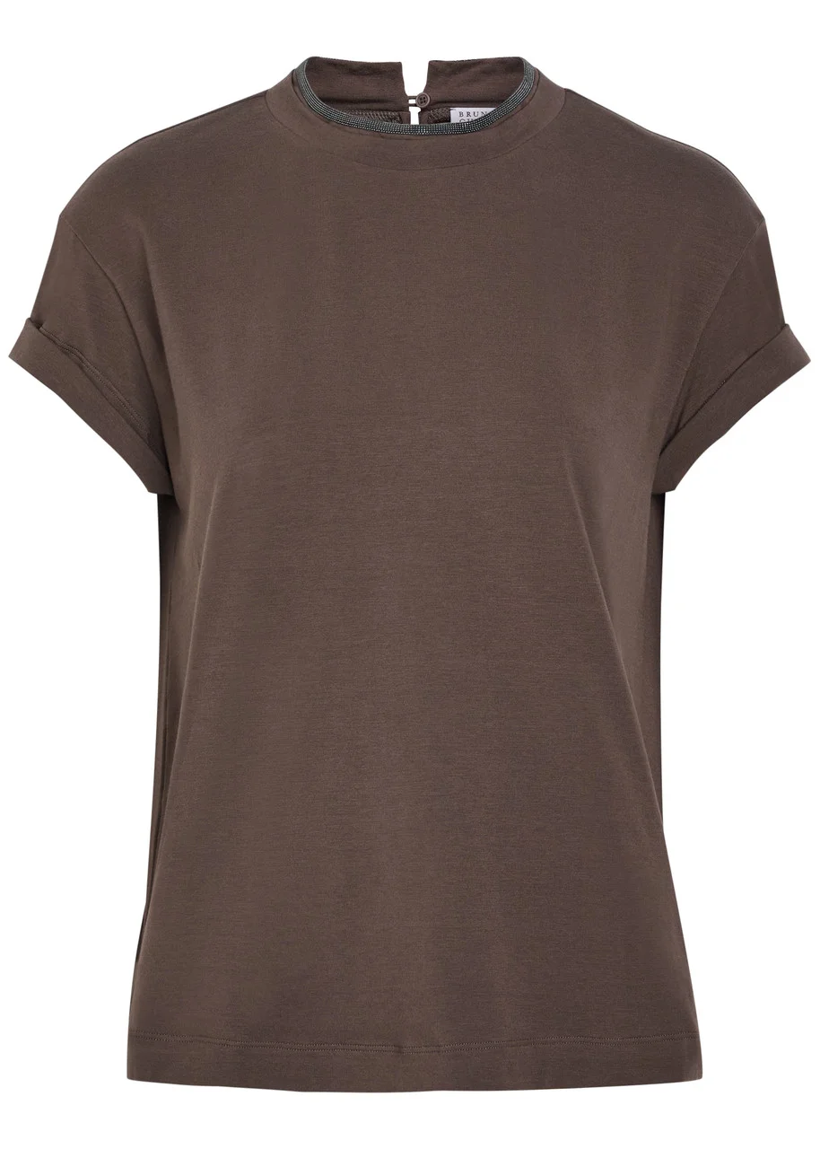 Info & Care Brunello Cucinelli stretch-cotton T-shirt Double-layered mock-neck with crystal embellishments,;turn-up cuffs Button fastening at back 93% cotton, 7% elastane Hand wash Size & Fit Length shoulder to hem: 23 inches/ 58.5cm Midweight Regular fit Model is 5'9"/ 175cm and wears a size small
