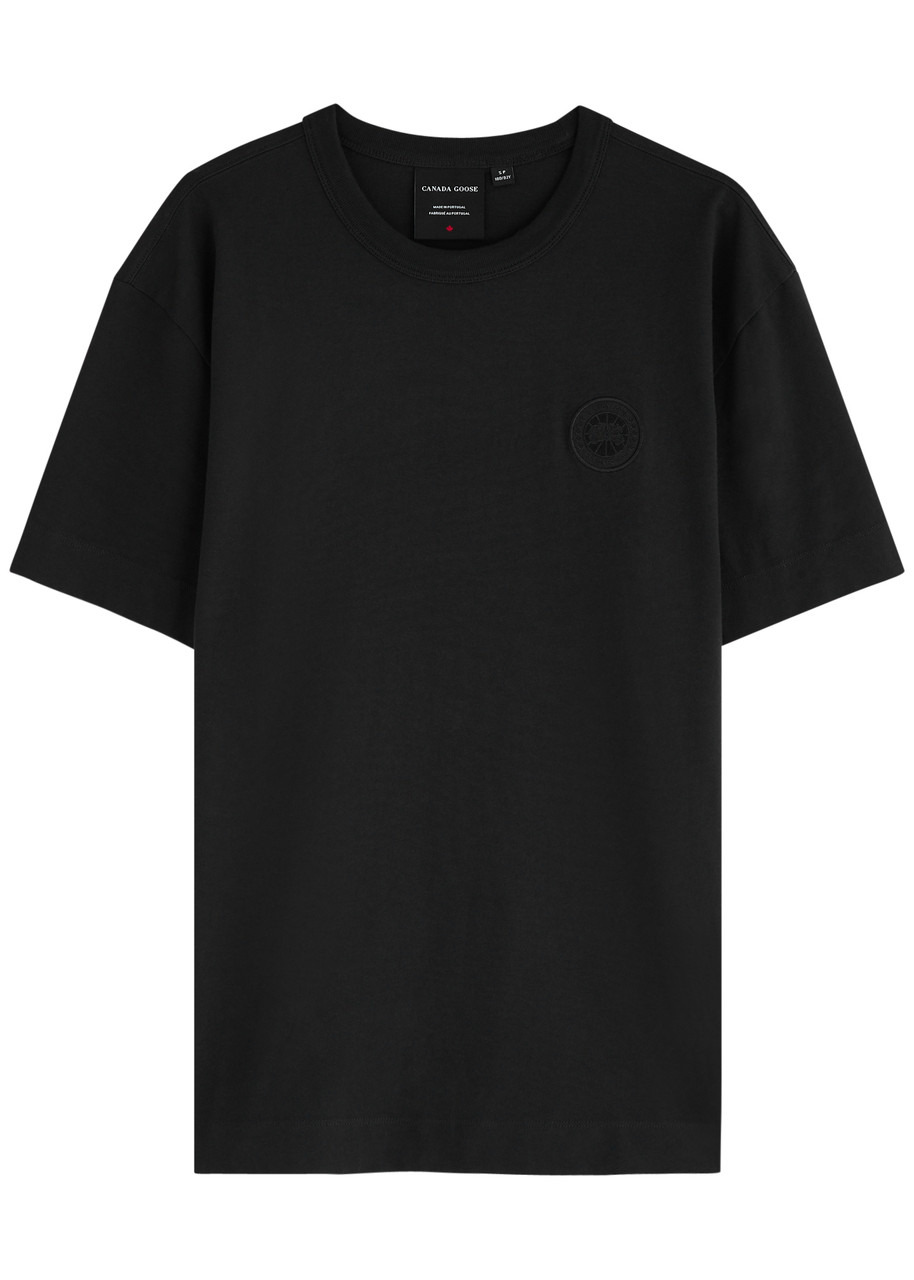 Info & Care Canada Goose cotton t-shirt Ribbed crew-neck, dropped shoulders, embroidered designer plaque at chest Slips on 100% cotton Machine wash Size & Fit Length shoulder to hem: 28 inches/ 71cm Midweight Relaxed fit Model is 6'1"/ 185cm, chest size 38 inches and wears a size medium;