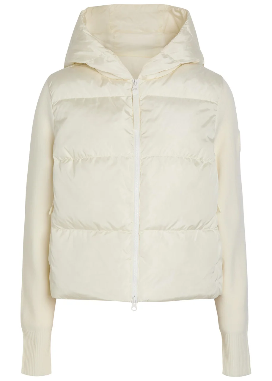Info & Care Canada Goose shell and wool-blend jacket Padded, hood, knit sleeves, designer plaque, ribbed cuffs, zip-fastening side slip pockets,;concealed drawstring at adjustable hem, partially lined Two-way zip fastening through front; Fabric 1: 90% wool, 9% polyamide, 1% elastane; fabric 2: 100% polyamide; lining: 100% polyamide; fill: 90% down, 10% duck feather Dry clean Size & Fit Length shoulder to hem: 20 inches/ 51cm Midweight Boxy fit Model is 5'9"/ 175cm and wears a size small