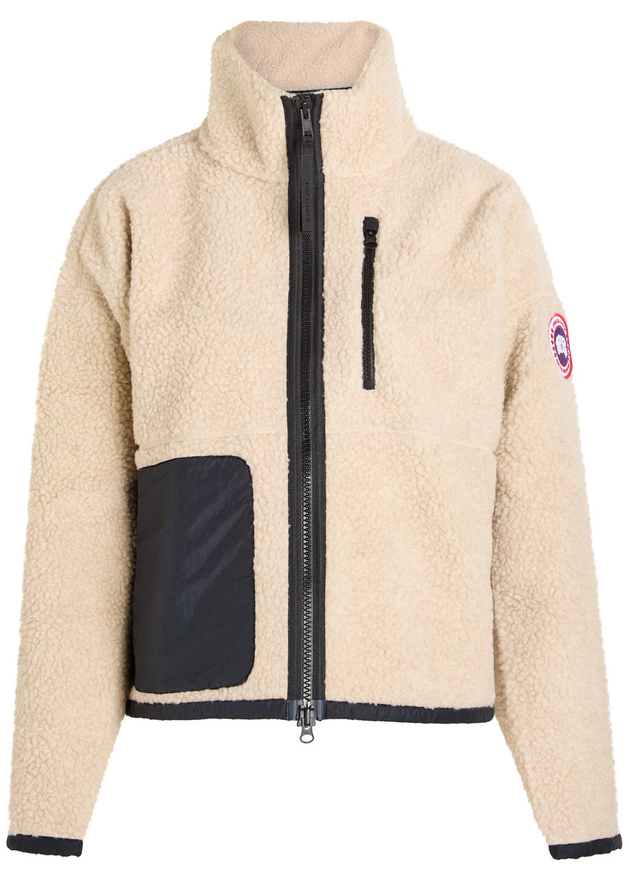 Info & Care Canada Goose fleece jacket High-neck, dropped shoulders, designer plaque at sleeve, three zip-fastening pockets at front, concealed toggle-fastening drawstring at hem, fully lined; Two-way zip fastening through front Fabric 1: 52% wool, 39% polyester, 5% polyamide, 4% other fibres, fabric 2: 100% Lyocell; fabric 3: 100% polyamide Dry clean; Size & Fit Length shoulder to hem: 22.5 inches/ 57cm Midweight Regular fit Model is 5'9"/ 175cm and wears a size small