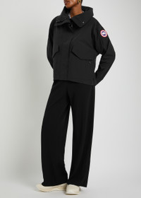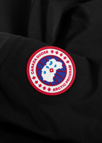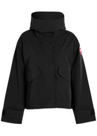 Info & Care Canada Goose;woven;rain jacket Waterproof, windproof, snorkel hood with back hood adjuster and reflective detail, rubber designer plaque at sleeve, adjustable velcro-fastening cuffs, zip-fastening side pockets, press-stud fastening flap pockets, storm flap with concealed mesh vent, inverted box pleat Concealed two-way zip and press-stud fastenings through front 87% polyamide, 13% elastane; contrast 100% polyester; lining 100% polyester Machine wash Size & Fit Length shoulder to hem: 27 inches/ 68.5cm Lightweight Loose, relaxed fit Cropped, hip length Size down for a more fitted look Model is 5'10"/ 178cm and wears a size small