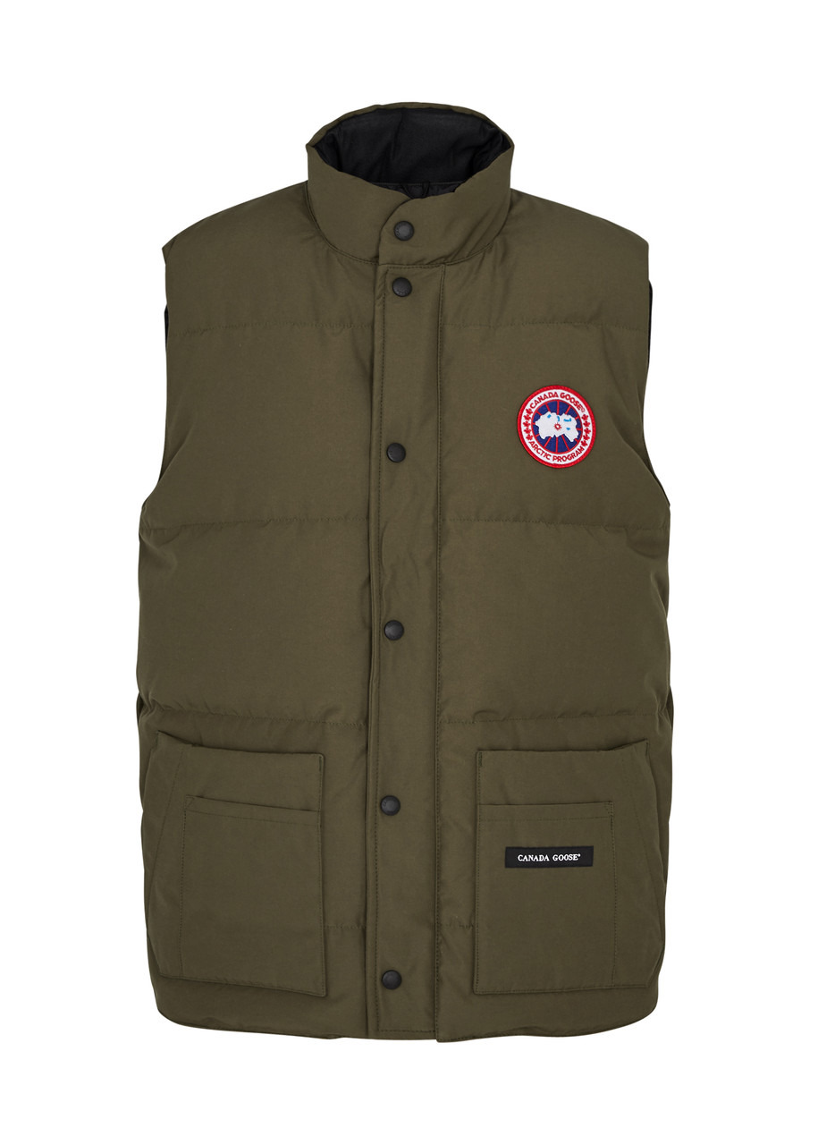 STYLE NOTES SKU No.: 944807_GREN Style No.: 944807 INFO & CARE - Canada Goose Arctic-Tech shell gilet - Water repellent, quilted, fleece-lined high-neck, embroidered designer patch appliqué, four front patch pockets, two side slant pockets, designer plaque, curved longer back hem, fully lined - Concealed zip and press-stud fastenings through front - 85% polyester, 15% cotton; lining: 100% nylon; fill: 80% down, 20% feathers (duck) - Dry clean SIZE & FIT - Length shoulder to hem: front: front: 27 inches/ 69cm; back: 29 inches/ 73.5cm - Midweight - Slim fit - Model is 6'2"/ 188cm, chest size 38 inches and wears a size medium