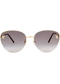 Info & Care Cartier gold-tone sunglasses Graduated grey lenses signature panther plaques half-rim frame designer-engraved arms black acetate tips 100% UV protection Presented in a designer-stamped box with a hard case and cleaning cloth Size & Fit Frame width: 14cm Frame height: 5cm