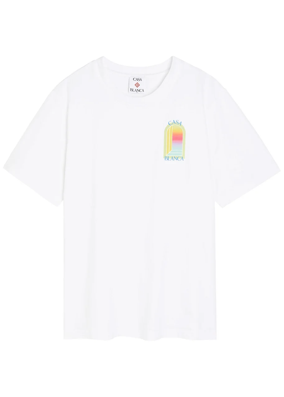 Info & Care Casablanca cotton T-shirt; Print at chest and back, ribbed crew-neck Slips on; 100% organic cotton; Machine wash; Size & Fit Length shoulder to hem: 28 inches/ 71cm Midweight Regular fit Model is 6'2"/ 188cm, chest size 38 inches and wears a size medium