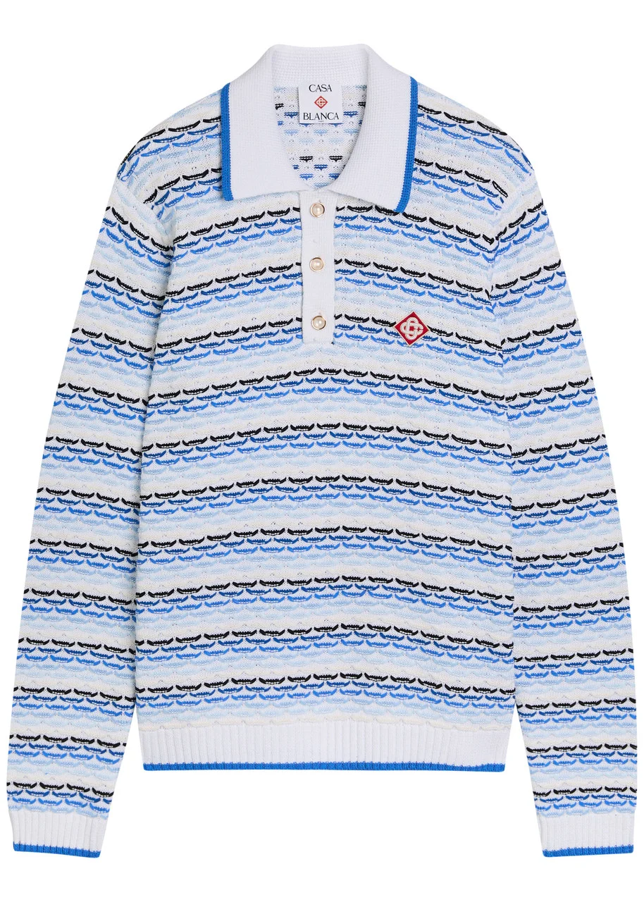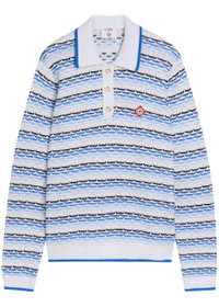 Info & Care Casablanca cotton-knit polo jumper Patterned tuck stitch design, button-fastening neck, raglan sleeves, embroidered designer applique at chest, striped ribbed trims Slips on 100% cotton Hand wash Size & Fit Length shoulder to hem: 27 inches/ 68.5cm Midweight Relaxed fit Model is 6'2"/ 188cm, chest size 38 inches and wears a size medium