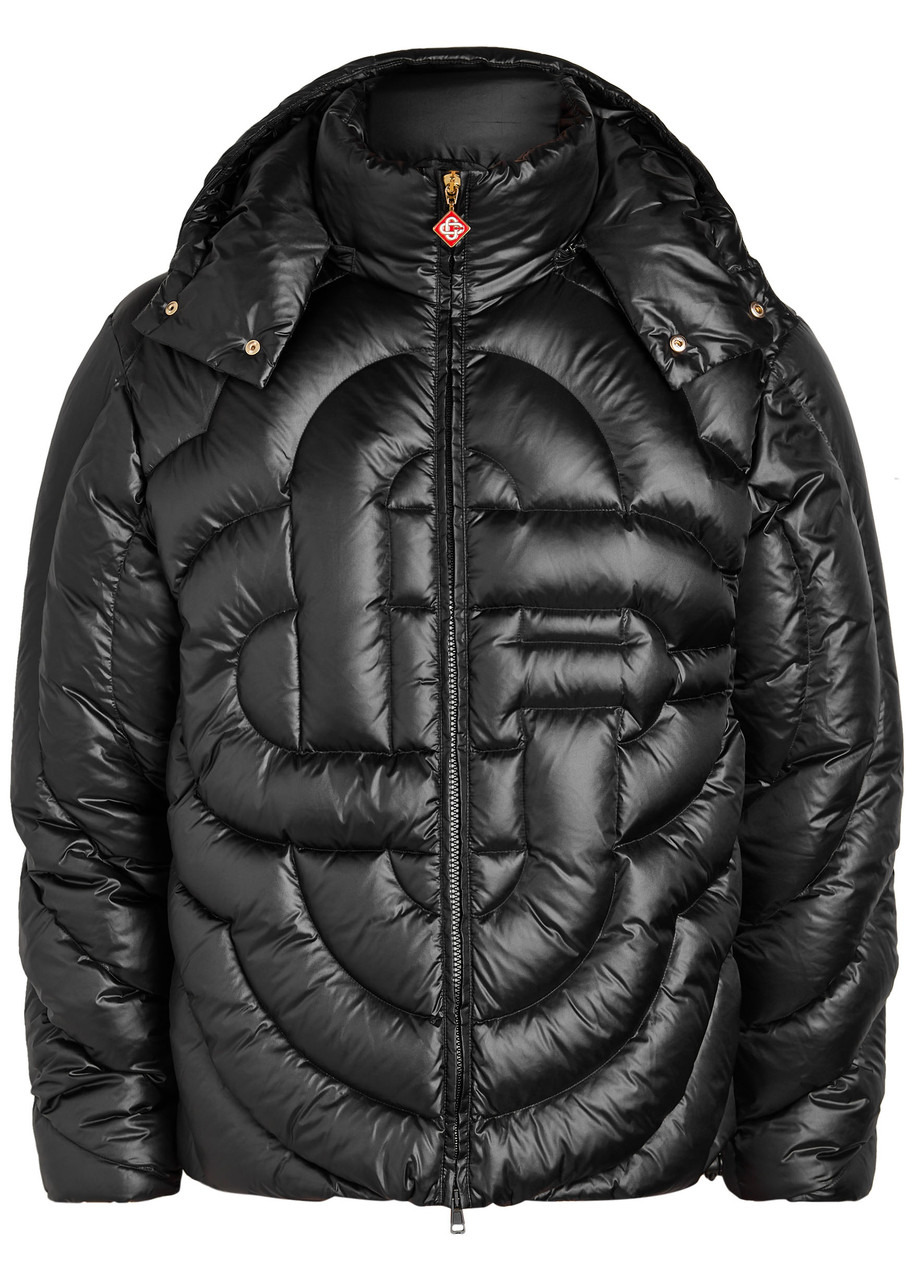 Info & Care Casablanca shell jacket Quilted logo monogram design, detachable drawstring hood with press-stud fastening funnel-neck, high-neck, logo-stamped elasticated panel at cuffs, enamelled logo plaque at zip-pull, zip-fastening side pockets, concealed toggle-fastening drawstring at adjustable hem, logo-sculpted hardware, internal zip-fastening pocket, fully lined Two-way zip-fastening through front Fabric 1: 100% polyamide; filling: 90% down, 10% feather Hand wash Size & Fit Length shoulder to hem: 26 inches/ 66cm Midweight Regular fit Model is 6'2"/ 188cm, chest size 38.5 inches and wears a size medium