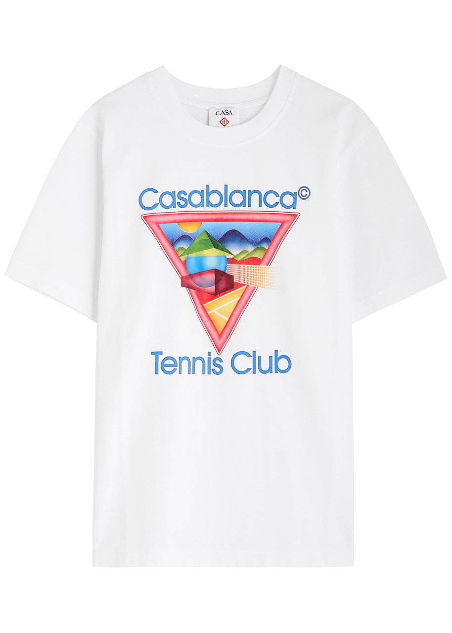 Info & Care Casablanca cotton T-shirt; Ribbed crew-neck, logo print at front; Slips on; 100% organic cotton; Machine wash; Size & Fit Length shoulder to hem: 27 inches/ 68.5cm Midweight; Relaxed fit Model is 6'1"/ 185cm, chest size is 38.5 inches and wears a size medium;