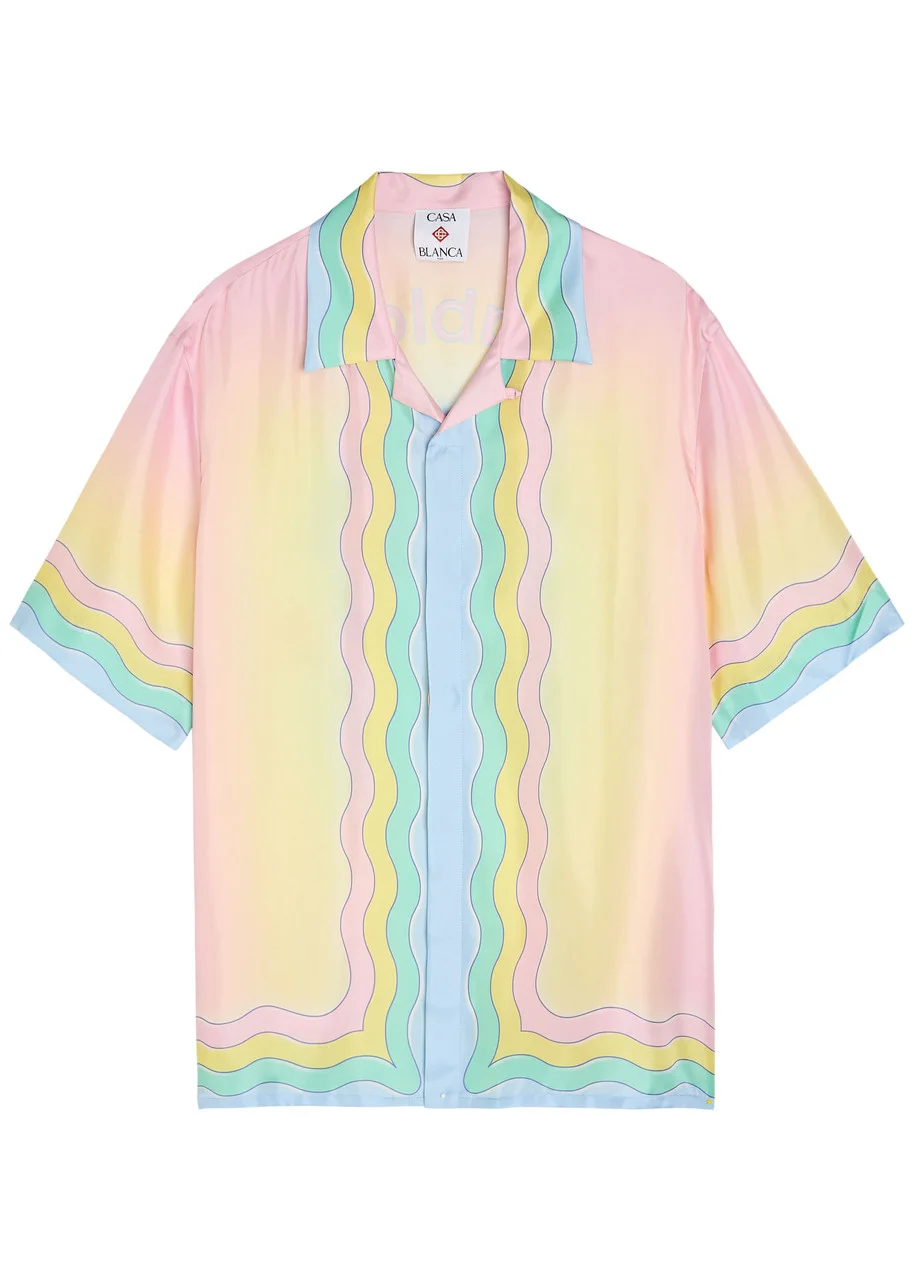 Info & Care Casablanca silk shirt Printed, degrade, button-fastening camp collar, wavy print trims Concealed button fastenings through front 100% silk Dry clean Size & Fit Length shoulder to hem: 28.5 inches/ 72.5cm Midweight; Relaxed;fit Model is 6'1"/ 185cm, chest size 38 inches and wears a size medium