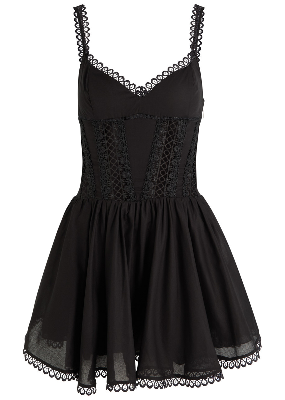 Info & Care Charo Ruiz Ibiza cotton-blend dress Floral and eyelet guipure lace inserts and trims, sweetheart-neck, boning at bust, pleated, smocked panel at back, scalloped trims, partially lined Slips on 90% cotton, 10% polyester Hand wash; Size & Fit Length shoulder to hem: 31 inches/ 79cm Midweight Close fit, flared skirt Model is 5'10"/ 178cm and wears a size small;