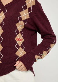 Info & Care Chloe wool and cashmere-blend jumper Argyle intarsia through front, V-neck, embroidered logo, scalloped and ribbed trims Slips on 71% wool, 29% cashmere Dry clean Size & Fit Length shoulder to hem: 23 inches/ 58.5cm Midweight Relaxed fit Model is 5'9"/ 175cm and wears a size small