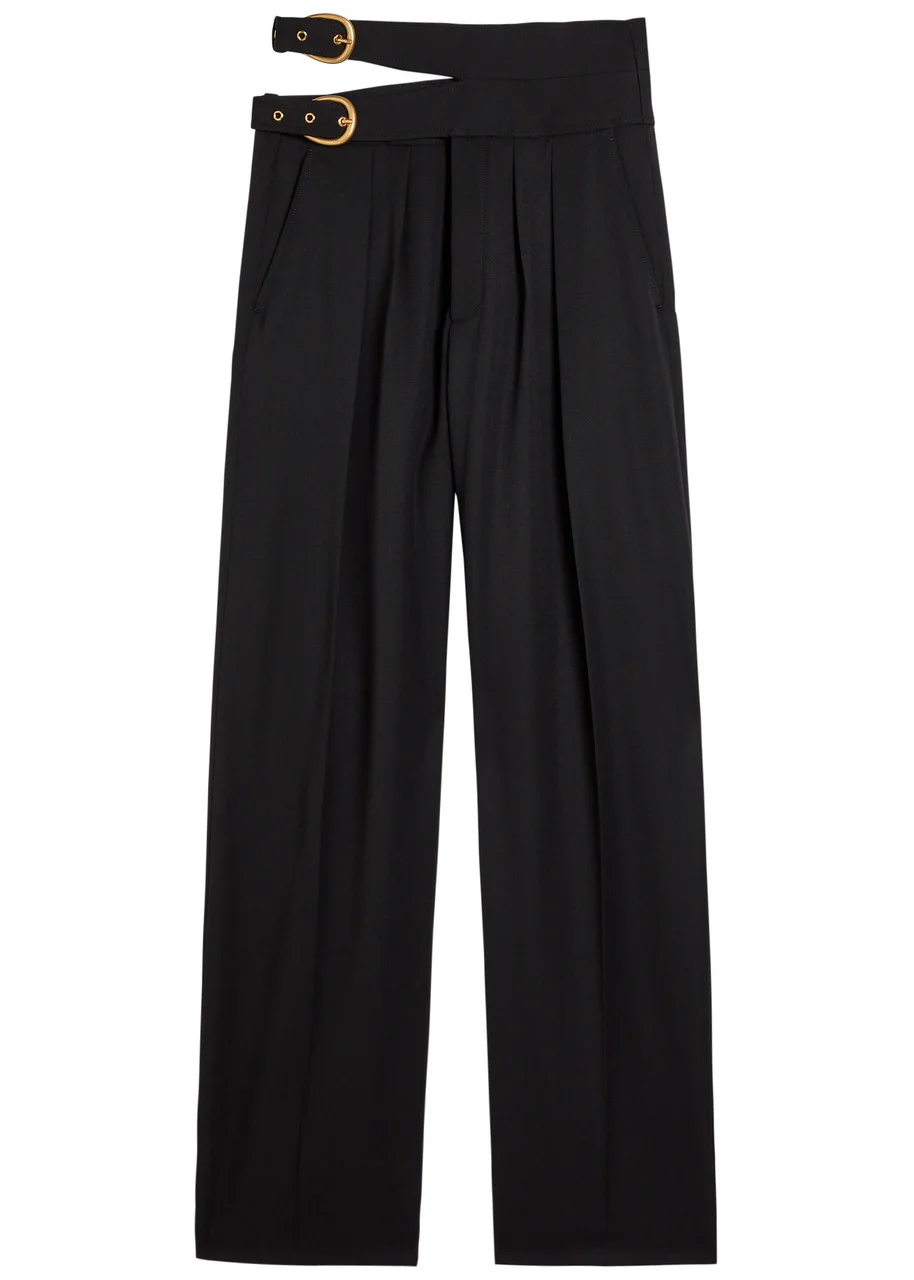 Info & Care Chloe wool trousers Adjustable buckle-fastening belted straps at waist,;asymmetric cut-out detail at waistband, side slip pockets, pleats at front, pressed crease through legs, back slit pockets Concealed zip, hook and button fastenings at front 100% virgin wool Dry clean Size & Fit Inside leg length: 32 inches/ 81.5cm Midweight Straight-leg cut, high-rise fit Tailored style Model is 5'9"/ 175cm and wears a size;FR36