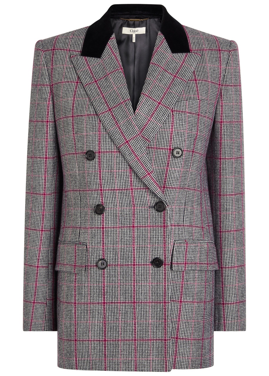 Info & Care Chloe wool blazer Checked weave, peaked lapels, velvet lapel, padded shoulders, button-fastening cuffs, chest slit pocket, two front flap pockets, back vent, internal slip pocket, internal button-fastening slip pocket, fully lined Double-breasted button fastenings at front Fabric 1: 100% virgin wool; fabric 2: 100% cotton; lining: 100% silk Dry clean Size & Fit Length shoulder to hem: 29 inches/ 73.5cm Midweight; Regular;fit Model is 5'9"/ 175cm and wears a size FR36