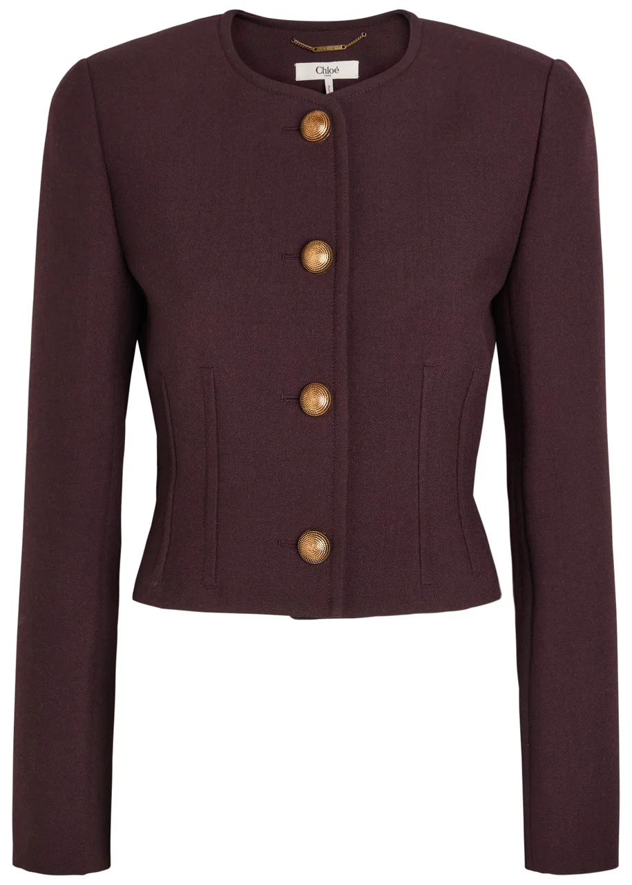 Info & Care Chloe wool jacket Round-neck, padded shoulders, darted, fully lined; Button fastenings through front 100% virgin wool; lining: 51% viscose, 49% cotton Dry clean Size & Fit Length shoulder to hem: 18.5 inches/ 47cm Midweight Slim fit, slightly cropped Model is 5'10"/ 178cm and wears a size;FR36