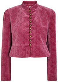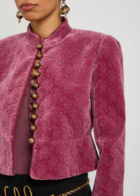 Info & Care Chloe velvet jacket Embroidered jacquard, stand collar, padded shoulders, button-fastening cuffs, twisted embroidered trims, fully lined Button fastenings through front 100% cotton; lining: 51% viscose, 49% cotton Dry clean Size & Fit Length shoulder to hem: 28 inches/ 46cm Slim, cropped fit Flared at hem Model is 5'10"/ 178cm and wears a size;FR36