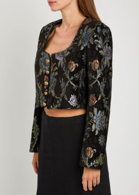Info & Care Chloe woven jacket Floral brocade with metallic weave, square-neck, lightly padded shoulders, picot lace trims, fully lined Textured button fastenings through front 50% viscose, 33% polyester, 9% silk, 8% polyamide; lining: 51% cotton, 49% cotton Dry clean; Size & Fit Length shoulder to hem: 16 inches/ 40.5cm Midweight Regular fit Cropped, boxy cut Model is 5'9"/ 175cm and wears a size;FR36
