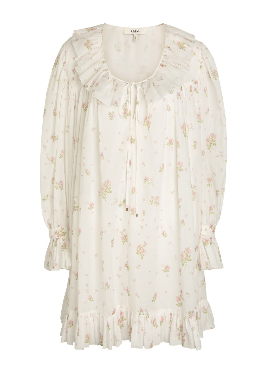 Info & Care Chloe cotton dress Floral print, tie-fastening round-neck with notch detail, button-fastening cuffs, gathered details, ruffled trims, fully lined Slips on 100% cotton; lining: 68% acetate, 32% silk Dry clean Size & Fit Length shoulder to hem: 34 inches/ 86.5cm Midweight; Loose;fit Model is 5'9"/ 175cm and wears a size FR36