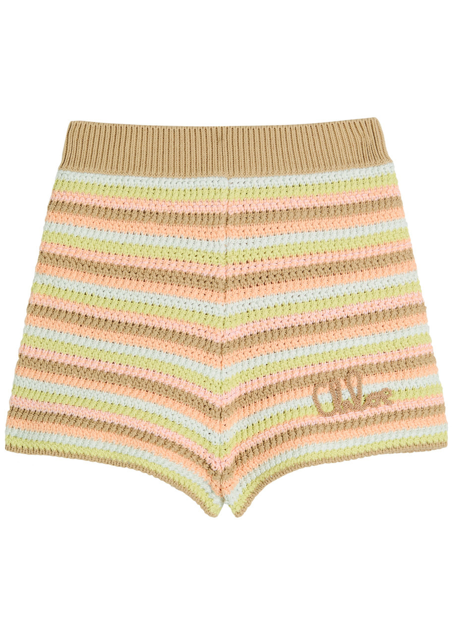 Info & Care Chloe knitted shorts Striped, ribbed waistband, embroidered logo Pull on 100% cotton Machine wash Co-ordinating item;available Size & Fit Length waist to hem: 12 inches/ 30.5cm Midweight Slim fit Model is 5'10"/ 178cm and wears a size small