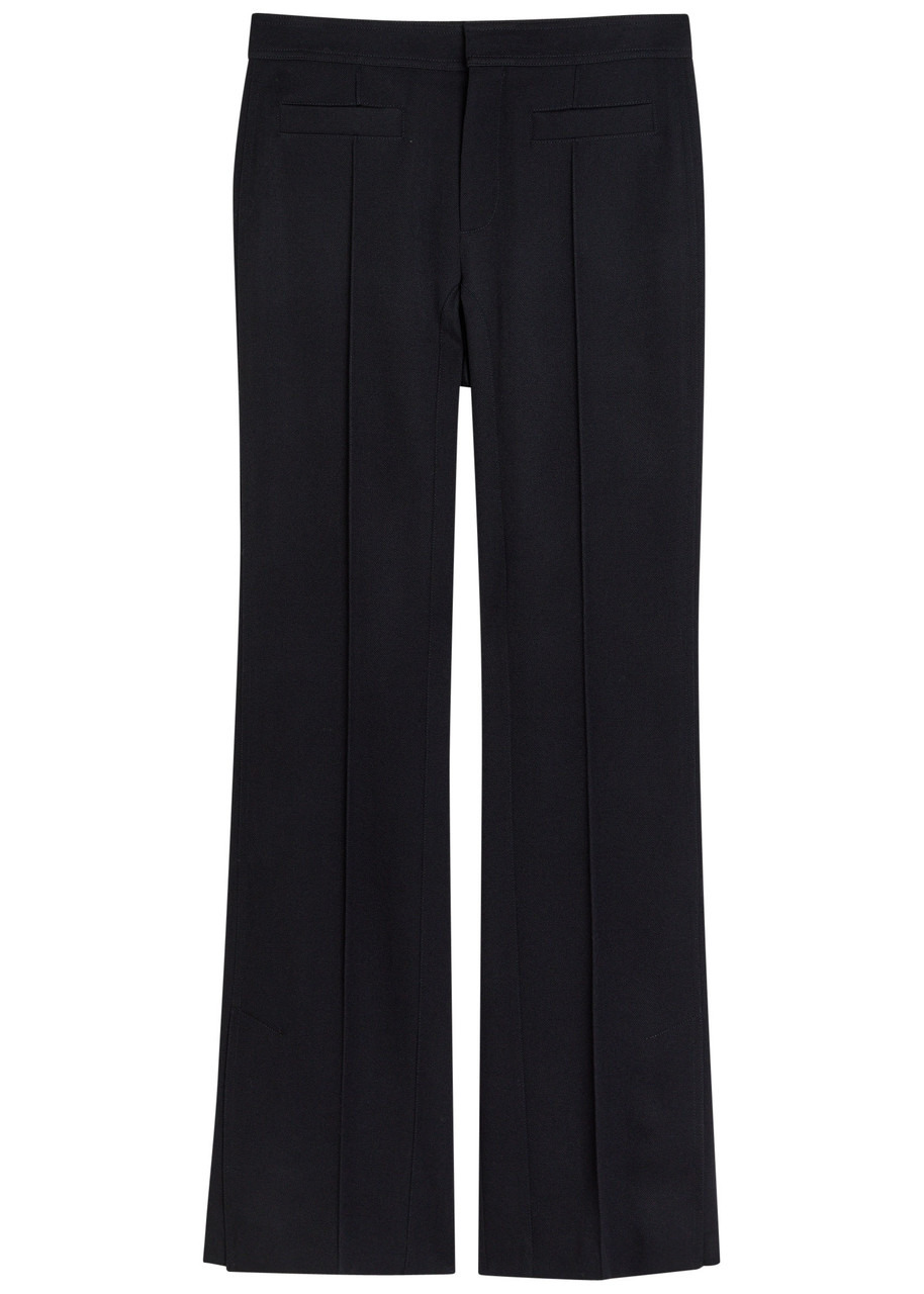 Info & Care Chloe wool trousers Pintuck through legs, front slit;pockets, designer-engraved D-ring embellishment at back, back slit pockets, side splits at cuffs Concealed button, hook and zip fastenings at front 100% virgin wool Dry clean Size & Fit Inside leg length: 33.5 inches/ 85cm Midweight Slim flared-leg cut Tailored style, designed to sit at the waist Model is 5'9"/ 175cm and wears a size;FR36