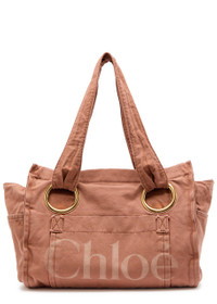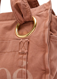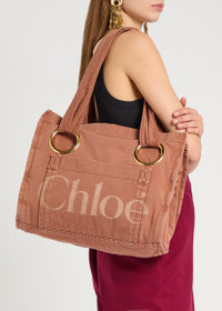 Info & Care Chloe cotton tote bag; Two top handles, designer logo at front patch pocket, side patch pockets, two internal patch pockets, washed finish Open top; Size & Fit Width: 15 inches/ 38cm Height: 11.5 inches/ 29cm Depth: 5.5 inches/ 14cm Top handle drop: 10.5 inches/ 26.5cm