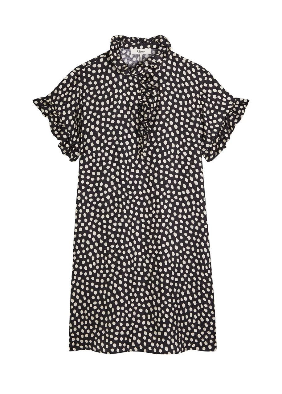 Info & Care Chloe silk dress Polka dots, stand collar,;button-fastening neck, ruffled trims, side slip pockets Slips on 100% silk Dry clean Size & Fit Length shoulder to hem: 35 inches/ 89cm Midweight Loose fit, straight cut Model is 5'10"/ 178cm and wears a size;FR36