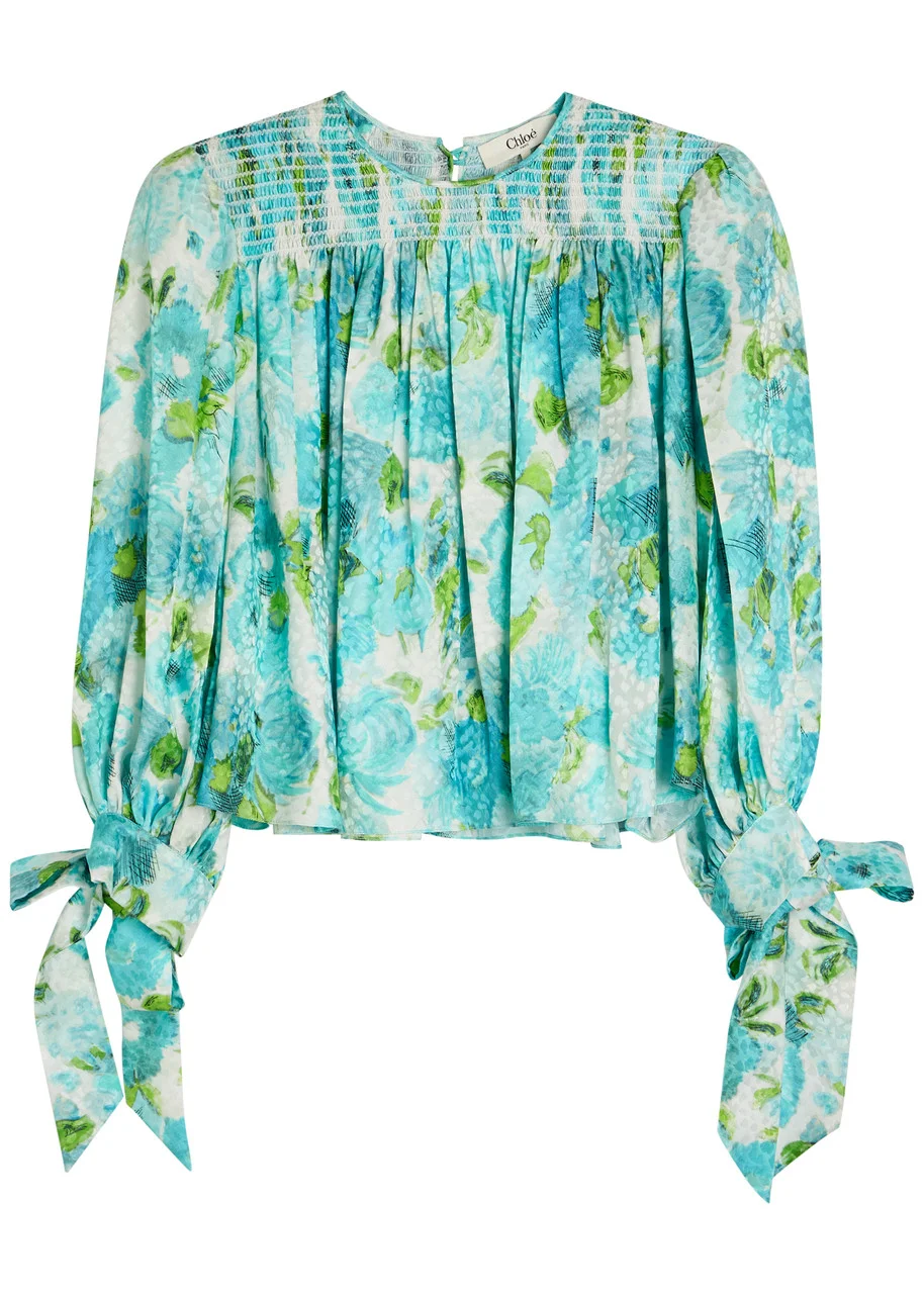 Info & Care Chloe silk blouse Printed, smocked panel at round-neck, raglan cropped sleeves, tie-fastening cuffs Button fastenings at back neck 100% silk Dry clean Size & Fit Length shoulder to hem: 19 inches/ 48cm Midweight Boxy fit,;cropped Model is 5'9"/ 175cm and wears a size;FR36