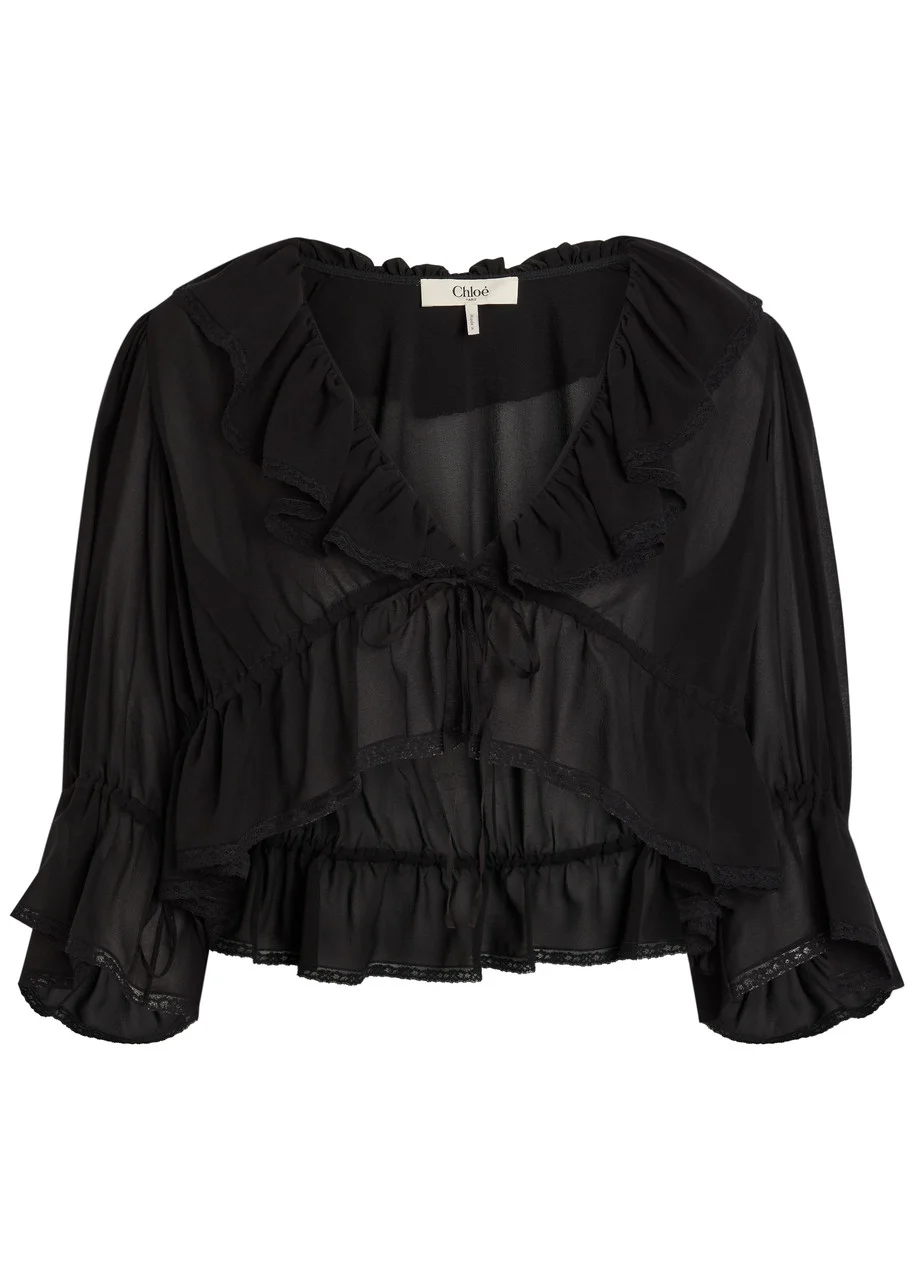 Info & Care Chloe silk-chiffon top Ruffled, button and tie-fastening V-neck, cropped sleeves drawstring cuffs, lace trims Slips on 100% silk Dry clean Size & Fit Length shoulder to hem: 18.5 inches/ 47cm Midweight Loose fit, cropped Model is 5'10"/ 178cm and wears a size;FR36