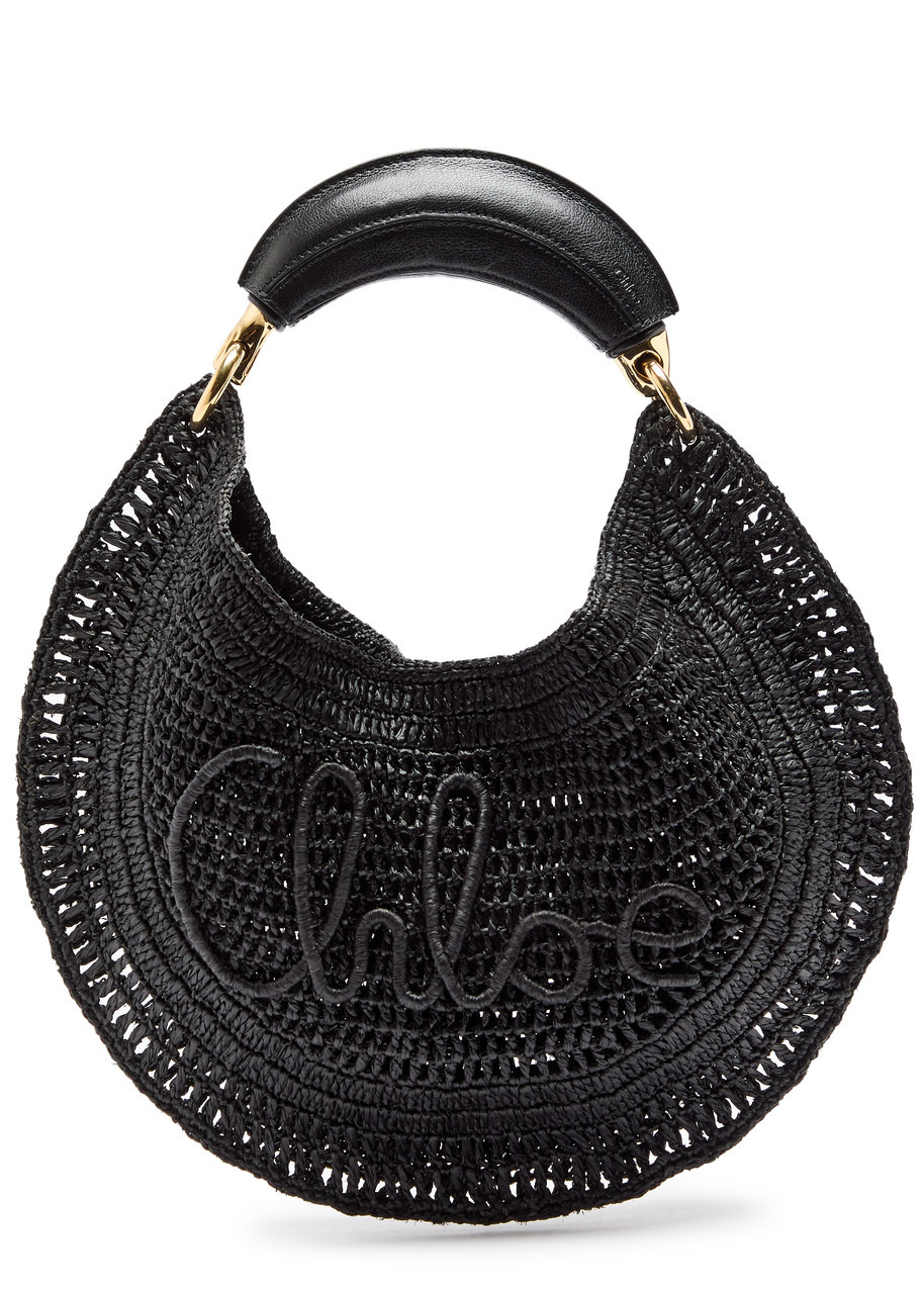 Info & Care Handmade; Chloe raffia;shoulder bag Leather top handle, open weave, woven designer applique, internal designer plaque,;internal patch pocket Concealed magnetic fastening at;top Size & Fit Width: 13.5 inches/ 34cm Height: 11 inches/ 28cm Depth: 1 inch/ 2.5cm Top handle;drop: 7 inches/ 18cm
