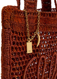 Info & Care Handmade; Chloe raffia tote Two shoulder straps, detachable;banana charm and designer hanging tag on chain, open weave, woven designer applique, internal designer plaque, two internal compartments Open top Size & Fit Width: 13.5 inches/ 34cm Height: 14.5 inches/ 37cm Depth: 1 inch/ 2.5cm Shoulder strap drop: 10.5 inches/ 27cm